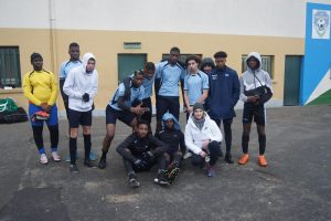 Finale départementale foot à 7 catégorie Juniors avec de gauche à droite : NGOM Mohamet – GABRIEL Andy – CLODION Anthony – LOPES Rafael – JEAN CHARLES Josué – DIAKITE Mamedy – KASSA Massinissa – ARIK Victor – BARRIE Alpha – MALONGA Oswald. Au sol : DERIVAL Claudens – MUTELA Michée – Meunier Charline (coach)