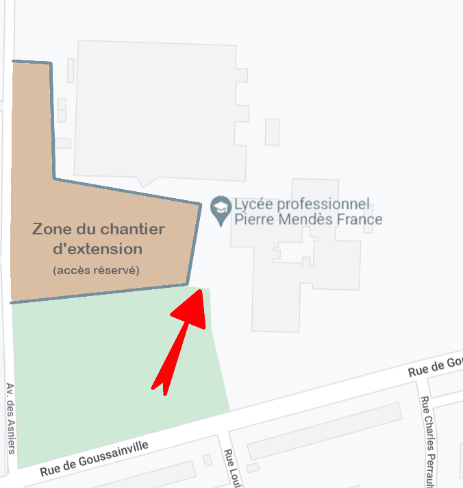 Attention : en raison des travaux d’extension, l’entrée se fera par le petit portail située le long de l’espace vert situé au 1 rue de Goussainville. (voir plan ci-dessous)